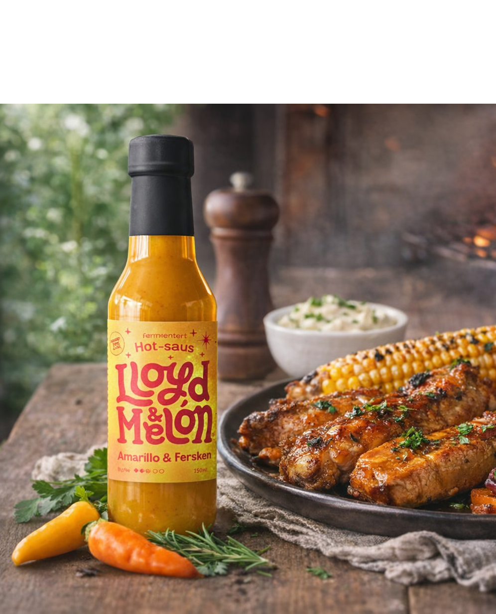 Fruktig fermentert hot sauce med fersken og Amarillo-chili. Balansert med ingefær og lime – perfekt til grillmat, ost, tacos og hverdagsmat. Vegansk og glutenfri.