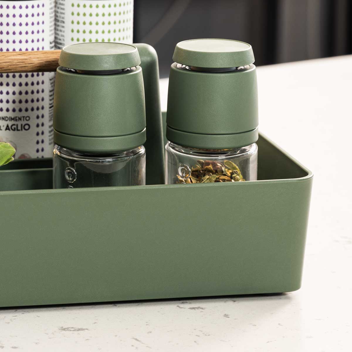Den grønne Vaasa-kvernen kombinerer praktisk funksjon med et design som føles både moderne og naturlig. Kvernhodet er laget i biokompositt med fibre fra bærekraftig skog, og den dype grønntonen gir assosiasjoner til både frisk skog og fruktig Kampot-pepper.